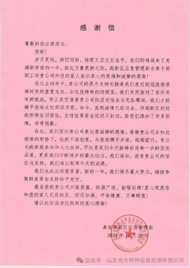 12月26日,山東光大特種設備檢測有限公司收到泰安高新區應急管理部發來的感謝信。感謝信認為,一直以來光大派駐到應急管理部的工貿企業專家,運用專業技術力量,精準查找監管盲區和潛在風險隱患,并指導企業完成整改,實現了安全隱患的動態清零,全面掃清了安全生產管理的死角。光大人認真、細致、耐心、專業的應急精神,為應急管理部的發展作出了積極努力和貢獻。感謝信對光大公司對高新區應急管理事業的大力支持表示感謝!以下為感謝信全文。